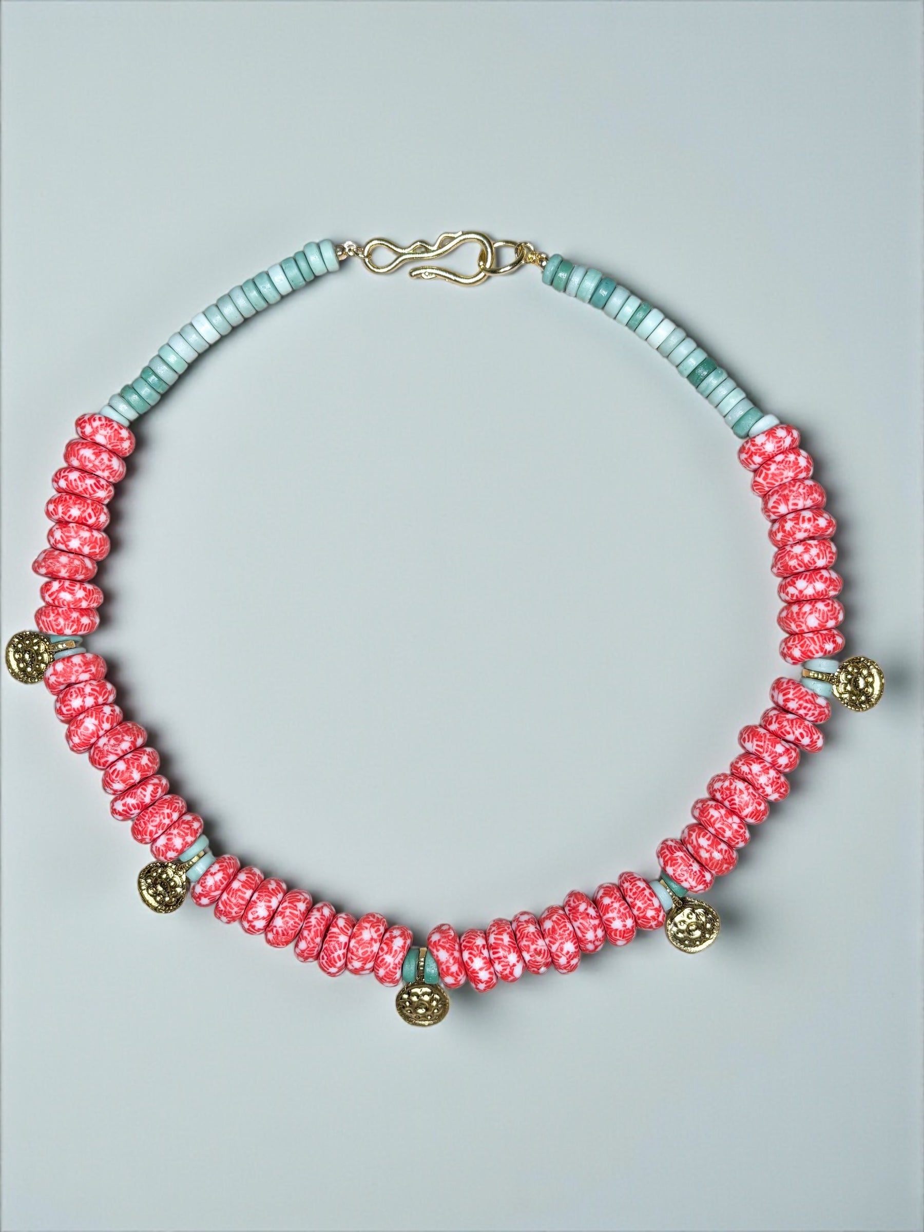 Una pieza que celebra la diversidad cultural y la sofisticación artesanal. El collar "Verde Pistacho" está cuidadosamente elaborado con materiales únicos que fusionan tradición, color y lujo: